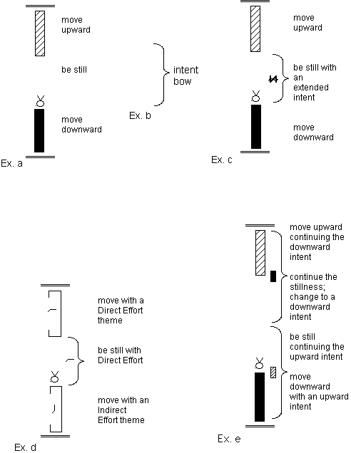 I have one possible solution. Perhaps one could use the curved bow shown in Ex. b, which is sometimes called the “intent bow.” A symbol that specifies the intent of the stillness could be placed inside the intent bow, as in Ex. c-d. The bow can also be used to specify attitudes or images that occur during movement, as in Ex. e.