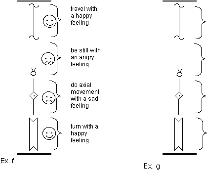 I find the intent bow is very useful in my creative dance classes for 5-6 year olds (Motif Description is an integral part of my curriculum). For instance, the theme of a recent class was “emotions” (angry, sad, happy, etc.). The children explored the theme through movement, song, and dramatic play. For the culminating activity they interpreted Ex. f, in which “face drawings” are used to indicate emotions. Then the children were each given a score with blank intent bows in which they drew faces or their own made-up symbols for feelings. (Ex. g)