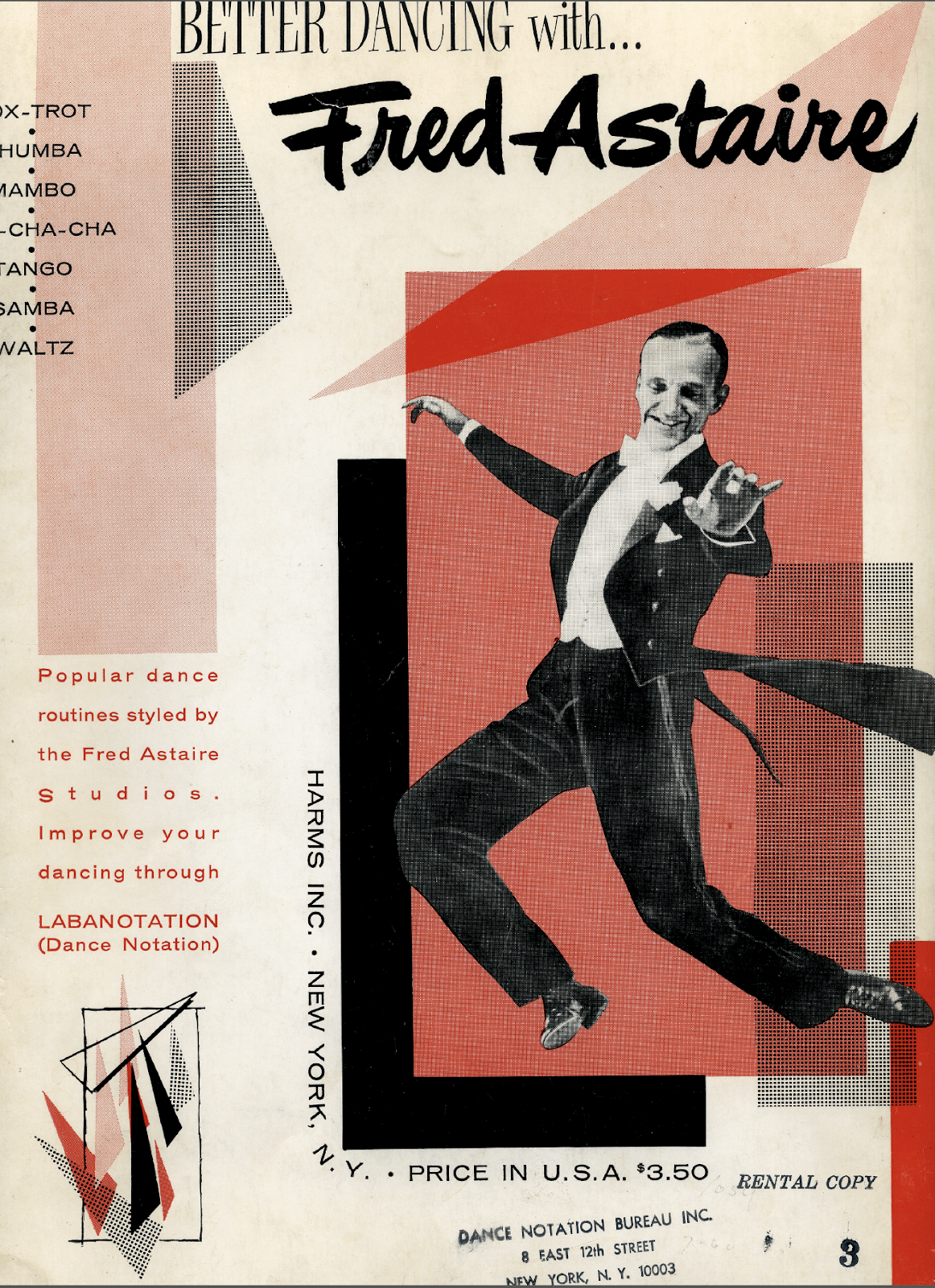 Better Dancing with Fred Astaire was published in 1957. Twelve Popular Dance Routines were styled by the Fred Astaire Dance Studio, including Fox Trot, Rhumba, Mambo, Tango, Samba, Cha cha cha, and Waltz. Labanotation was by Ann Hutchinson, word description by Edwin J. Sims, and music arranged by William C. Schoenfeld.