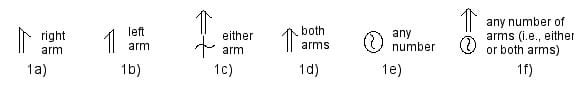 In Motif Notation there is a way to indicate a “right” body part,” “left” body part,” “either” body part,” or “both” body parts, e.g., right arm, left arm, either arm, both arms. (Ex. 1a-1d) However, there is no established way to indicate “either or both” body parts. One idea is to place a pre-sign for “any number” before the body part sign. At a recent DNB theory meeting Ann Hutchinson Guest suggested using Albrecht Knust’s sign for “any number.” The sign consists of an ad lib. sign inside a circle, as in Ex. 1e. (I like this sign better than the one I proposed in previous postings, e.g., Wile, Movement in Place Thread, April 10, 2000). Thus Ex. 1f would indicate the “right or left or both arms.”