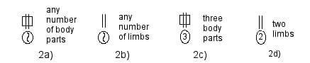 The encircled ad lib. sign could also be used in indications for “any number of unspecified body parts” (Ex. 2a), “any number of limbs” (Ex. 2b), etc. This fits the established method of indicating a specific number of body parts, such as three unspecified body parts, two limbs, etc. (Ex. 2c and 2d).