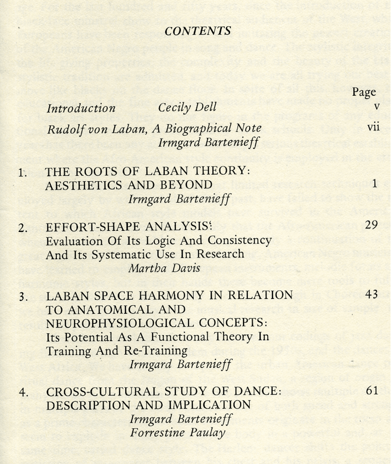 “The four essays were originally lectures given in a seminar at the Dance Notation Bureau in 1968. The authors collaborated in forming the first training program in Effort-Shape in the United States in 1965. They have since become researchers and teachers in more specialized applications of Effort-Shape, and these essays reflect their current work.