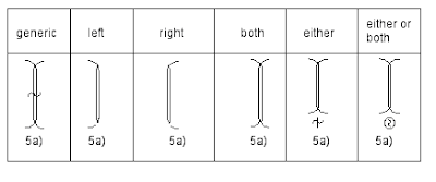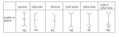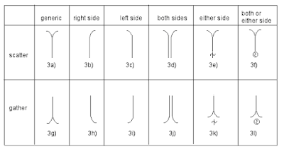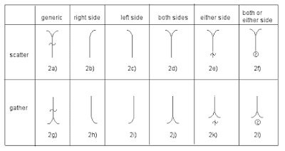Following is a proposal that includes a more complete paradigm, including generic indications and signs for scattering (gathering) on “either or both” sides. For information on the pre-signs in 2e,f, k, l see the Body Portions thread, July 16, 2002.