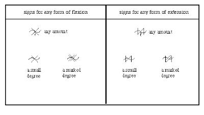 We have experimented with using a vertical ad lib. sign, centered on the symbols, placed where the dots would go if we were using the 6/6 scale. Using this idea, Ex. 2a represents “any degree of any form of flexion,” and 2b represents “any degree of any form of extension.” Unfortunately, when both vertical and ad lib. signs are included, these indications seem cumbersome and too spidery.