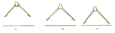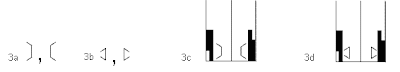 Sagittal Closing (Joining) or Separating. Also applicable are the signs for sagittal opening (separating), 3a, or closing (joining), 3b, when forward and backward leg gestures are used. These sagittal signs have been developed for movement exploration needs and are included in Motif Notation. Ex. 3c shows increased sagittal separating, while 3d indicates sagittal closing in.