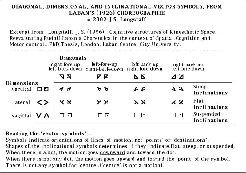 My work with what I call ‘vector symbols’ from Laban’s (1926) Choreographie, reveals a ‘movement conception’ of choreutics which makes any talk of ‘points’ or ‘positions’ redundant.