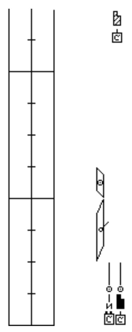 In the above example carets are used in count 2 to show that the movement is still for the upper and lower legs. Count 3 shows a movement for the whole leg as it is in the designated column for that body part. In count 4, the presigns have been repeated. A caret for the lower leg would be incorrect as the previous symbol is not for the lower leg. Since the presign was repeated for the lower leg, we found it easier to read if we repeated both presigns. A caret could have been used for the upper leg. Note that the inner subsidiary column (where the upper leg is placed) follows the same practice as the leg gesture column. When tied to the support column for use as an extra support column, it follows the same rule as the support column.