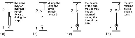 I should point out that some people might disagree with my interpretation of 1a and 1c. In Guest, Your Move, p. 295, it says that ” automatic cancellation is the rule in Motif Description — do not retain the results of a previous activity.” According to this rule, in 1a the arms’ forward position would be cancelled during the step, and in 1c the arm flexion would be cancelled when the arm turns. I feel this “automatic cancellation” rule creates problems, and would prefer the rule to be as I’ve stated above. I plan to discuss my ideas on this topic in a future posting.