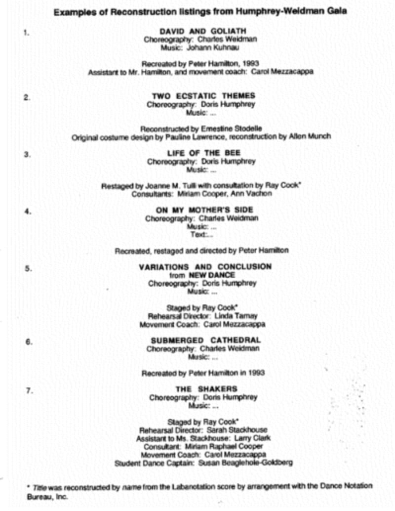 – Reconstructed by (name of person) from the Labanotation Score by arrangement with the Dance Notation Bureau.