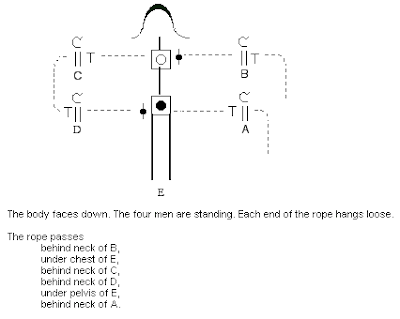 I recently notated “Legacy” for the Cloud Gate Dance Company. One section involves a long “rope” used to carry off a dead body that is facing down. When the Labanotation is laid out across five staffs it is very difficult to visualize. I find that adding a drawing like the following gives a quick, easy and clear reference.